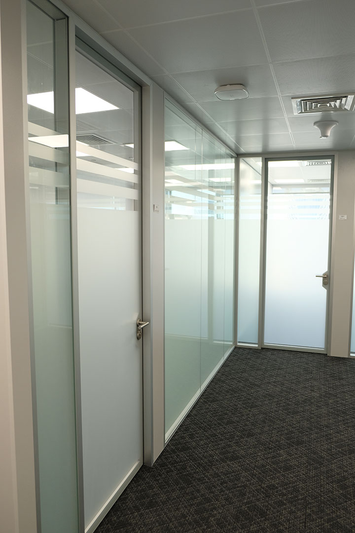 Designed to optimise natural light while delivering a high acoustic performance, these glass partitions effectively separated high-traffic areas from quieter workspaces, maintaining a sleek, modern aesthetic. With frosted manifestations being added to ¾ of the glass, visual privacy was achieved whilst the top ¼ allowed an influx of natural light.